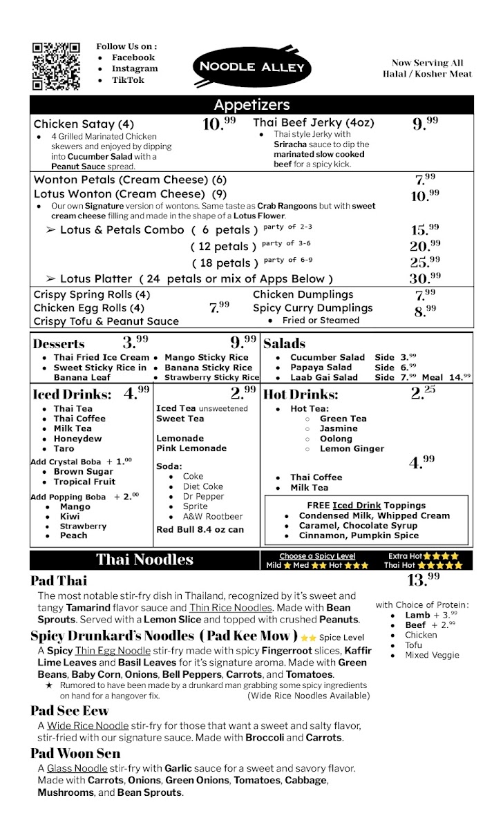 For beverages, the tempting Thai Tea and Green Tea complete the experience, ensuring you remain refreshed as you savor each bite. Customer reviews praise the freshness and authenticity of the dishes, showcasing the passion behind the kitchen. Whether dining in or enjoying a takeout meal, Noodle Alley promises a delightful experience worth exploring again and again.